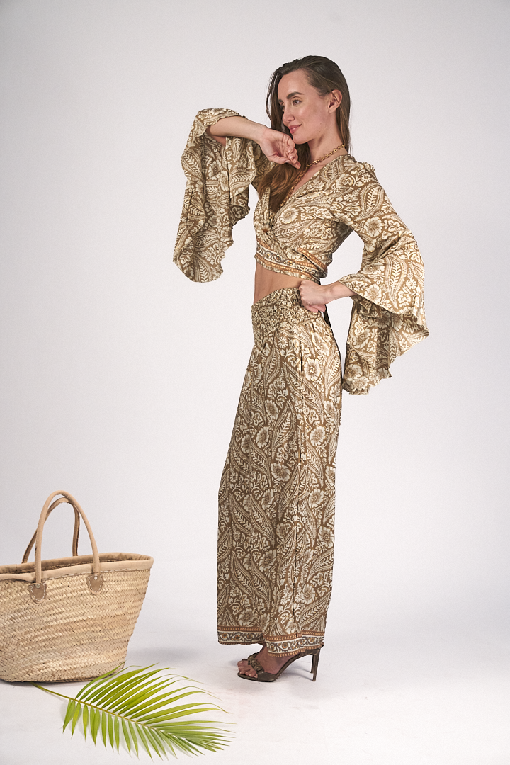 Wide leg silk trousers with side pockets and an elastic waistband.