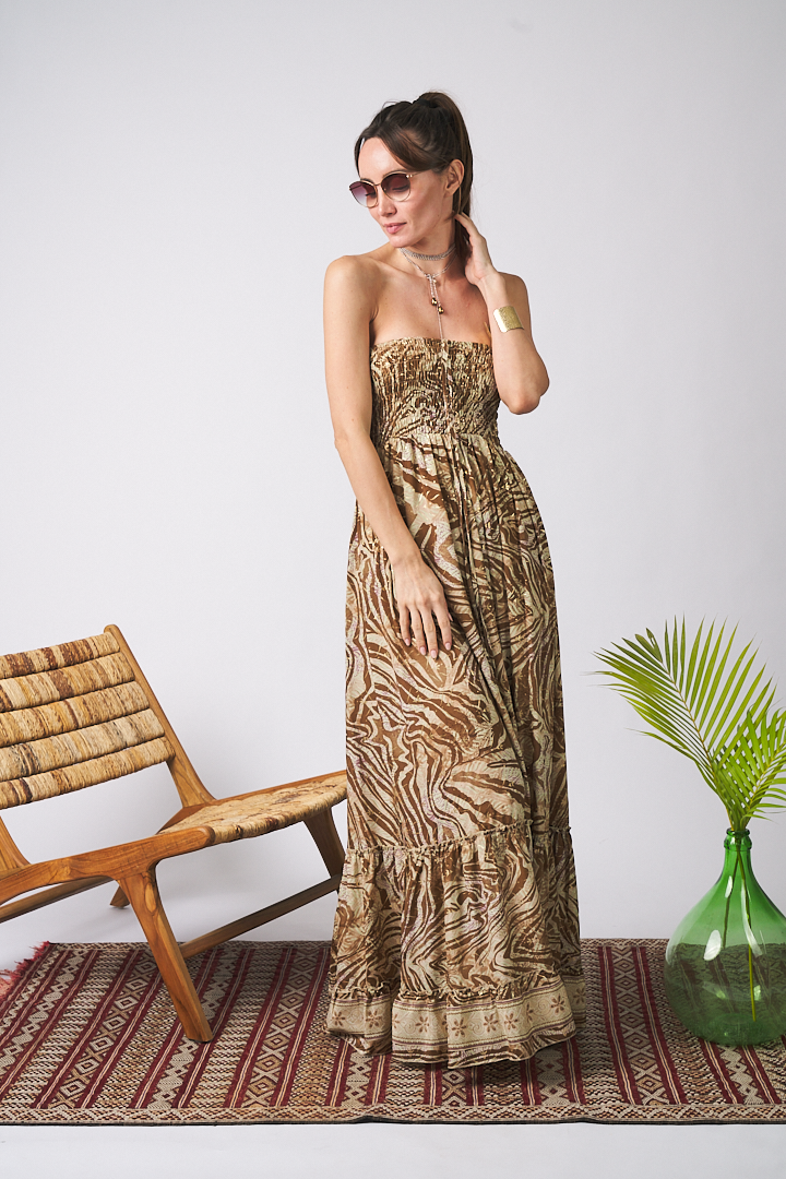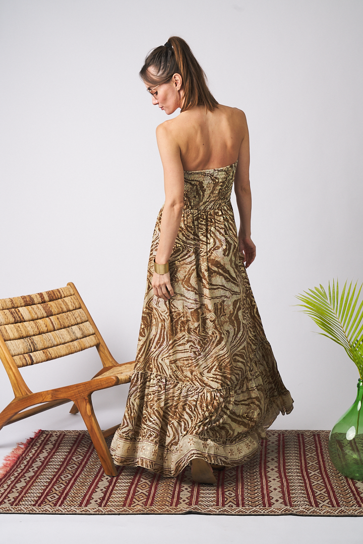 Long dress in artisanal printed silk with a soft scoop neckline and smocked bodice.