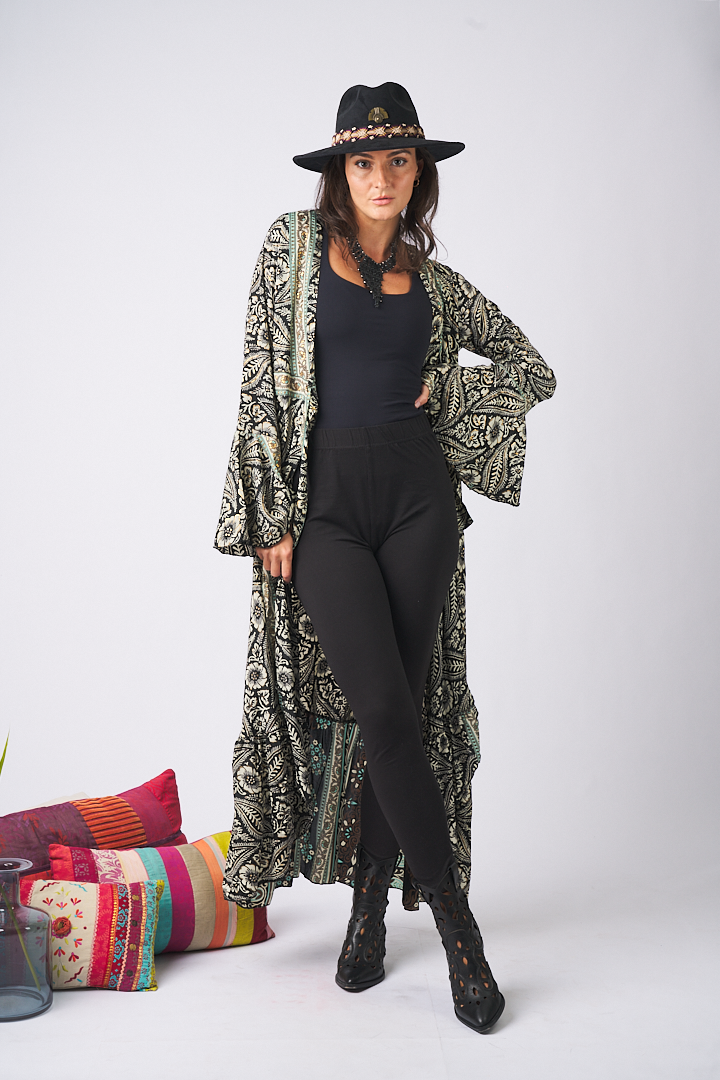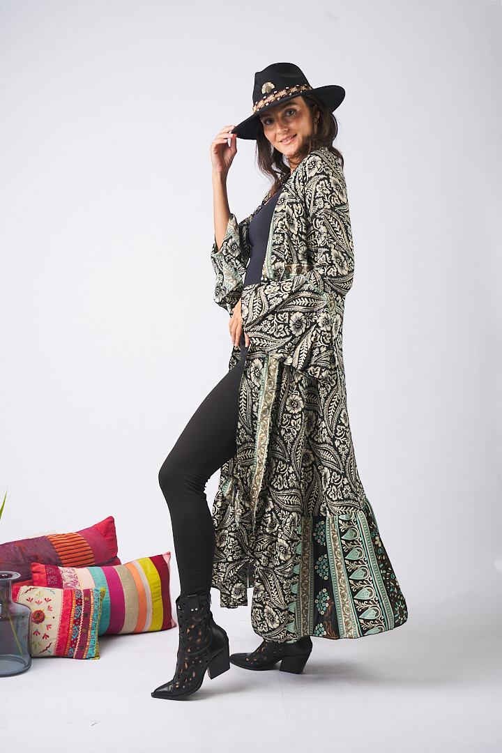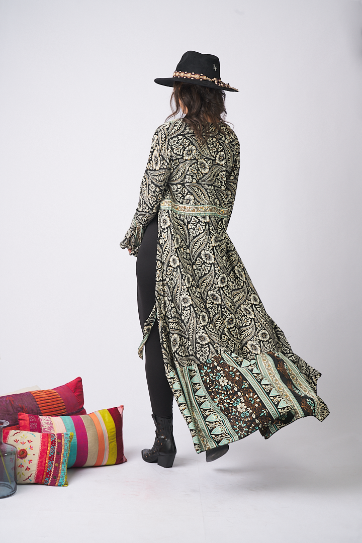 Maxi kimono in artisanal printed silk with flared sleeves.