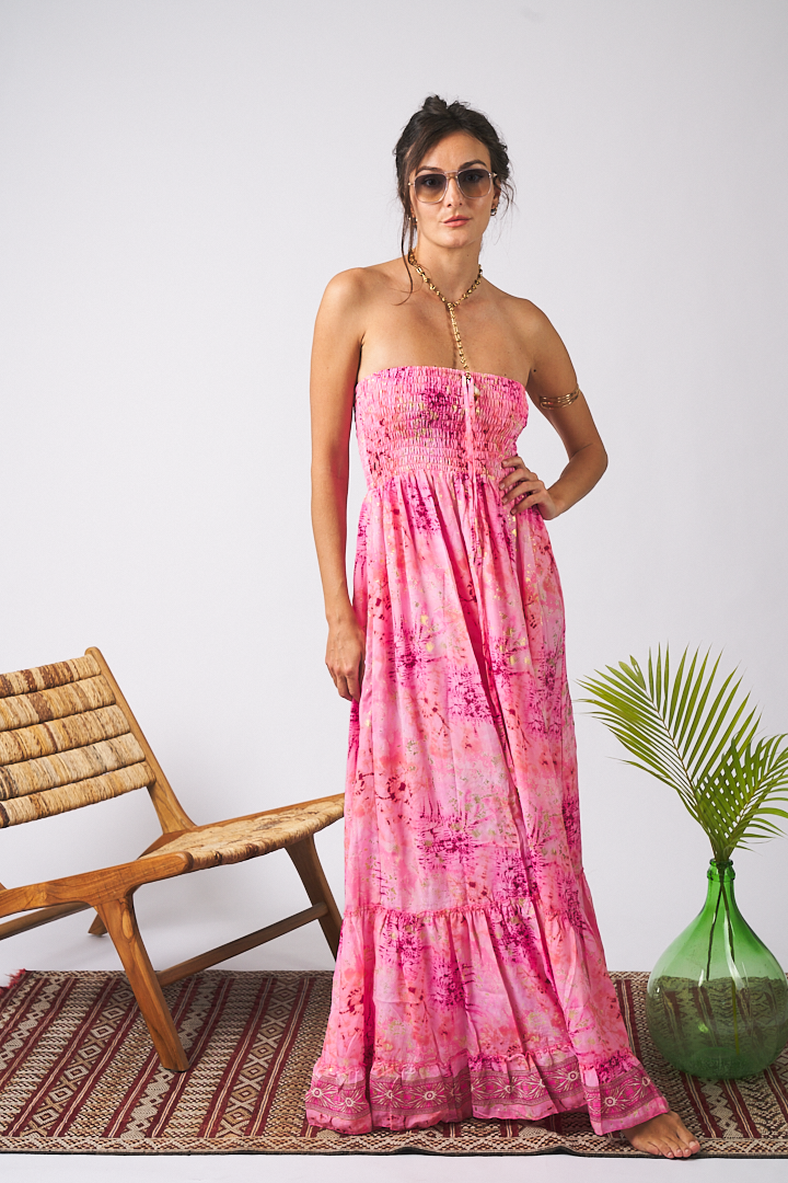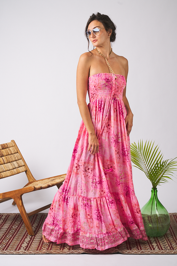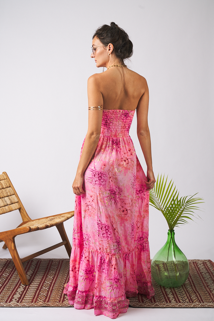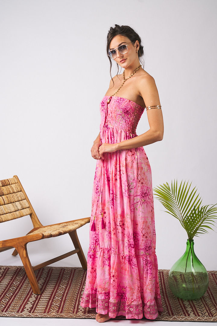 Long dress in artisanal printed silk with a soft scoop neckline and smocked bodice.
