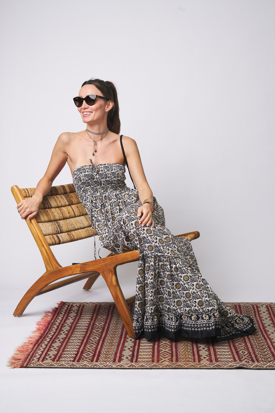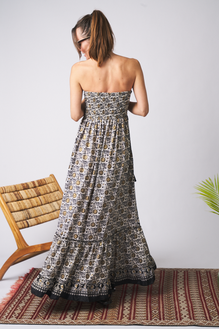 Long dress in artisanal printed silk with a soft scoop neckline and smocked bodice.