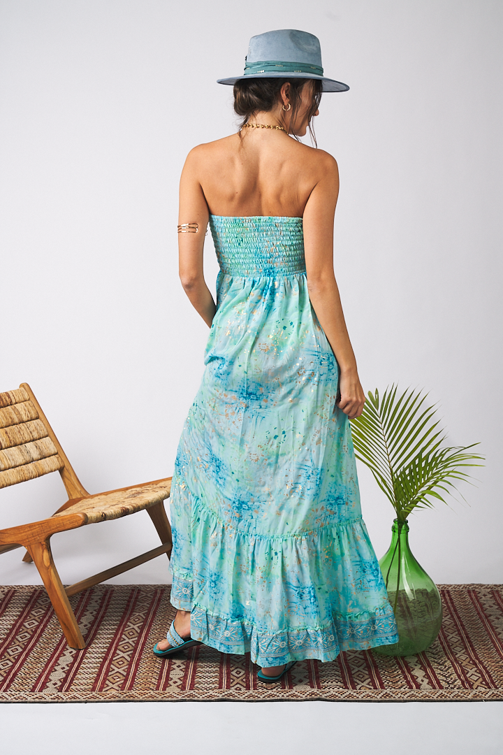 Long dress in artisanal printed silk with a soft scoop neckline and smocked bodice.