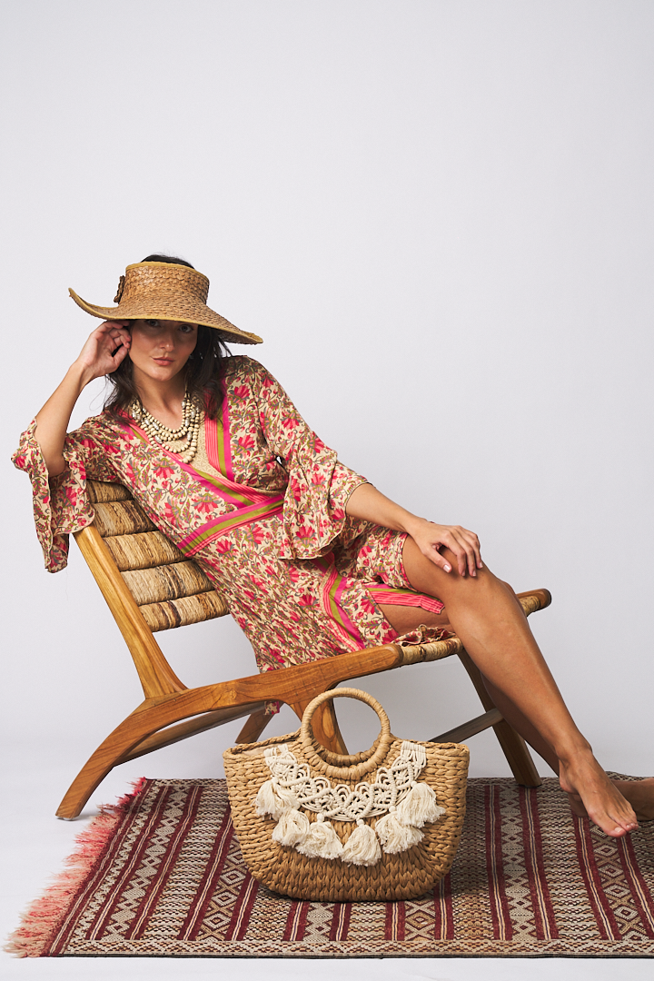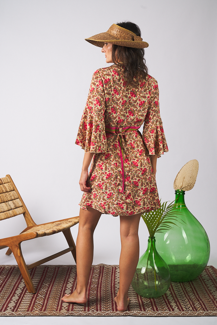 Short silk kimono with flared sleeves. Can be worn wrapped as a dress or open as a lightweight layer.
