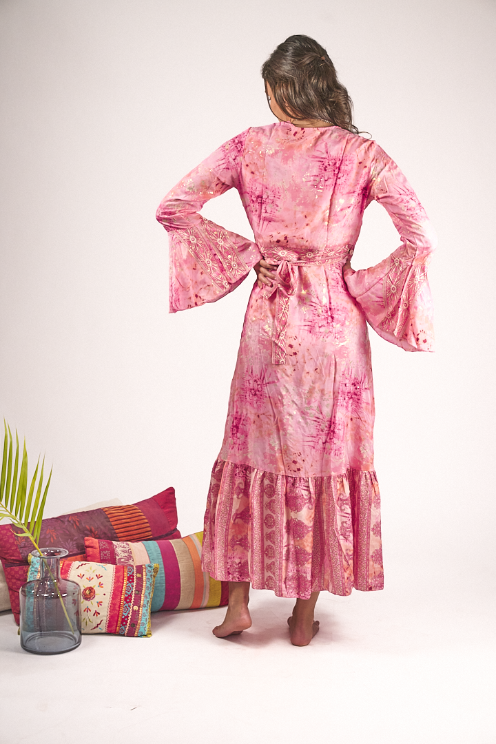 Maxi kimono in artisanal printed silk with flared sleeves.
