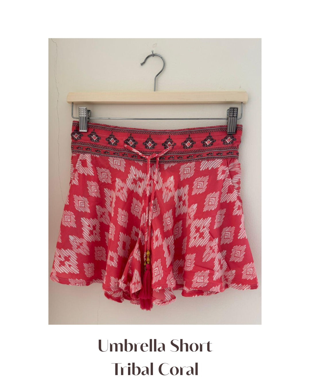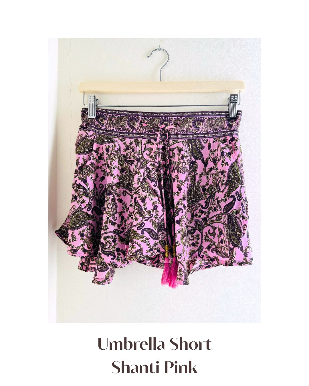 Flowy silk shorts with pockets, elastic waistband, and playful tassel details.